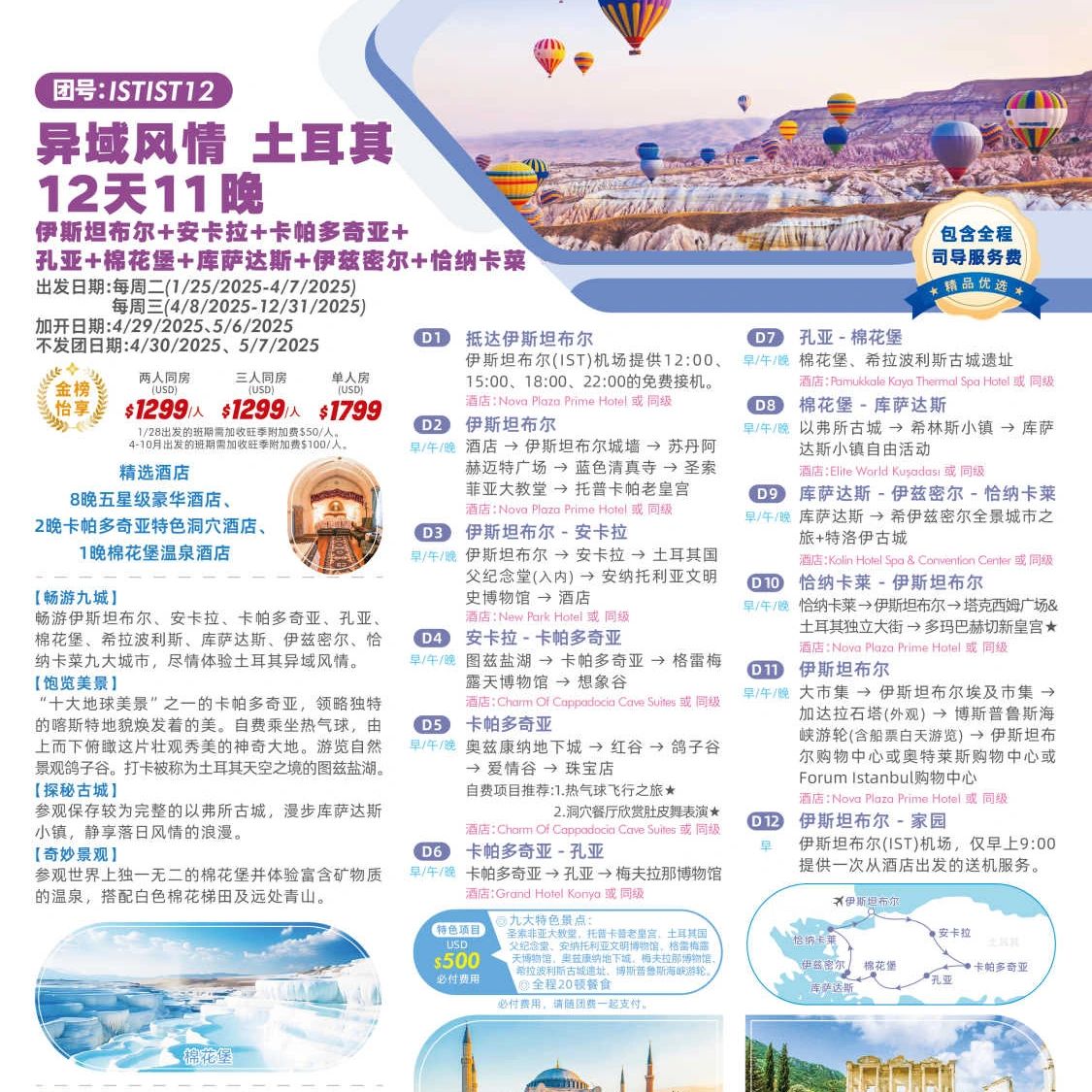 畅游伊斯坦布尔、安卡拉、卡帕多奇亚、孔亚、棉花堡、希拉波利斯、库萨达斯、伊兹密尔、恰纳卡菜九大城市,尽情体验土耳其异域风情。